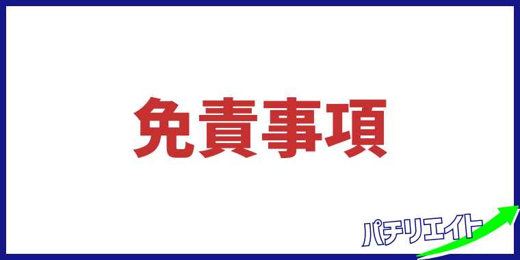 「パチリエイト」からのリンクやバナーなどで移動したサイトで提供される情報、サービス等について一切の責任を負いません。 また「パチリエイト」のコンテンツ・情報について、できる限り正確な情報を提供するように努めておりますが、正確性や安全性を保証するものではありません。 情報が古くなっていることもございます。 「パチリエイト」に掲載された内容によって生じた損害等の一切の責任を負いかねますのでご了承ください。